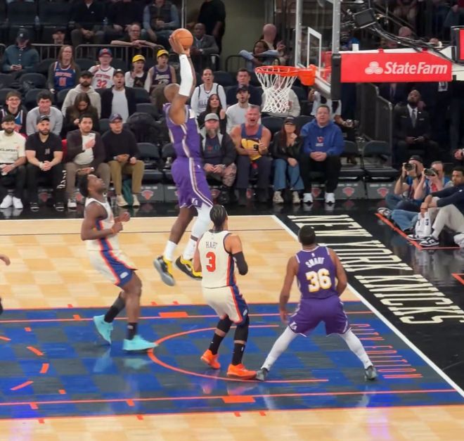 這場比賽41歲的勒佈朗-詹姆斯又成為麥迪遜廣場花園最閃耀的那顆星,他在上半場就完成瞭一次空接暴扣,這一球斯瑪特傳給他恰到好處,詹姆斯高高躍起完成瞭平筐空接。