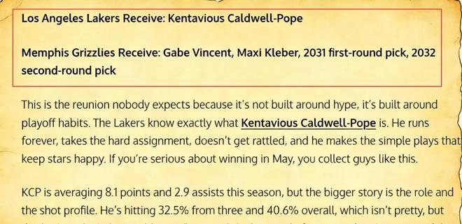 美媒《Fadeaway World》便提出瞭這樣一筆“小修小補”式的交易方案,他們建議湖人送出文森特、克萊伯、2031年的首輪簽以及2032年的次輪簽,從灰熊引入後衛波普。