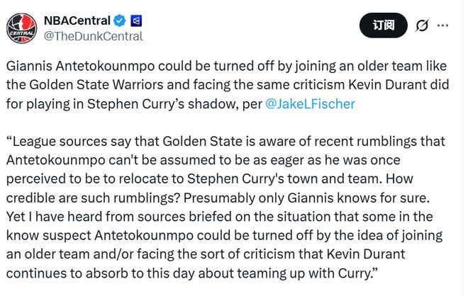 “聯盟消息人士透露,勇士方面已察覺到近期的一些流言:外界此前默認字母哥會迫切渴望加入庫裡所在的球隊、來到這座城市,但事實可能並非如此。這類流言的可信度究竟有多高?想必隻有字母哥本人最清楚。不過,據知情人士透露,一些圈內人猜測,字母哥或許會打退堂鼓 —— 一方面是因為勇士陣容年齡偏大,另一方面則是他不想落得和杜蘭特一樣的下場,至今仍因當年聯手庫裡而飽受詬病。”
