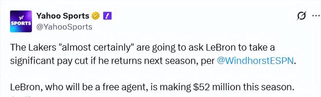 名記文霍斯特表示:“賽季結束後——無論湖人的賽季何時落幕——詹姆斯都要面臨兩個重大抉擇。第一,他是否要再打一個賽季。而他的態度也很明確,他自己目前也沒有答案,對此我是相信的。第二,如果他決定再戰,他願意接受多少薪資。因為湖人幾乎肯定會要求他降薪,而且幅度可能還不小。”