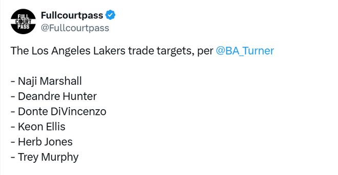 湖人隊記佈拉德-特納撰文稱:“據多位NBA內部人士透露,與湖人隊傳出緋聞的潛在引援目標包括達拉斯獨行俠隊的納吉-馬紹爾——他曾是東契奇的隊友,此外還有克利夫蘭騎士隊的德安德烈-亨特、明尼蘇達森林狼隊的唐特-迪文琴佐以及薩克拉門托國王隊的基翁-埃利斯。新奧爾良鵜鶘隊的特雷-墨菲三世和赫伯特-瓊斯也是湖人表現出興趣的兩名球員,聯盟中多支球隊同樣對他們有意。不過據NBA消息人士透露,鵜鶘對這兩人的要價極高,各隊都在觀望,等待其在下周交易截止日前是否會降低籌碼。”