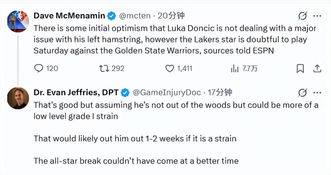 在McMenamin的最新報道出來後,Jeffries跟進表示,這樣的結果算是不錯瞭,但他的情況還不能完全掉以輕心,大概率隻是一級輕度拉傷。如果確診是拉傷的話,他很可能會缺陣1-2周。全明星周末來得真是太是時候瞭。顯然,Jeffries認為全明星周末會是很好的養傷時間。