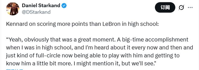 有美媒報道,肯納德高中生涯得到2977分,甚至高於詹姆斯的高中生涯(2657分)。談及高中時期得分比詹姆斯多,肯納德表示:“當然,那是段超棒的回憶,也是我高中時的一大成就。直到現在偶爾還會有人提起這事,如今能和他並肩作戰、慢慢更瞭解他,感覺一切都很圓滿。我或許會跟他提提這事,不過看情況吧。”