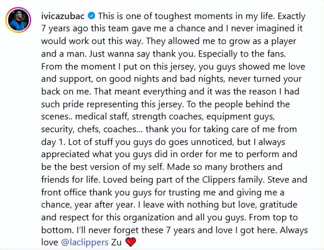 這是我人生中最艱難的時刻之一。整整七年前,這支球隊給瞭我機會,我從未想過會以這樣的方式結束。他們見證瞭我從一名球員到一個男人的成長蛻變。千言萬語,唯有感謝。尤其要感謝球迷們。從我披上這件球衣的那一刻起,無論順境逆境,你們始終對我傾註愛意與支持,從未離棄。這份情誼重於一切,也是我身披快船戰袍時,心中滿溢自豪的源泉。