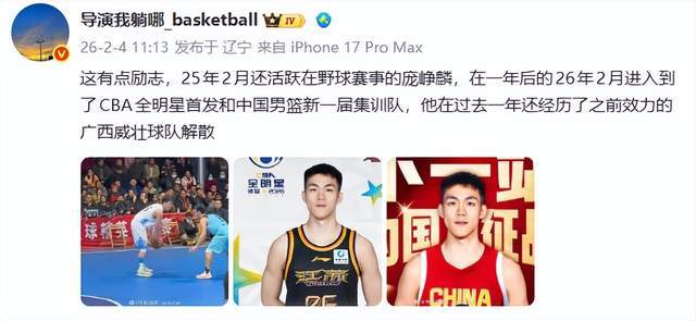 就像“導演我躺哪”說得那樣:“這有點勵志,25年2月還活躍在野球賽事的龐崢麟,在一年後的26年2月進入到瞭CBA全明星首發和中國男籃新一屆集訓隊,他在過去一年還經歷瞭之前效力的廣西威壯球隊解散。”