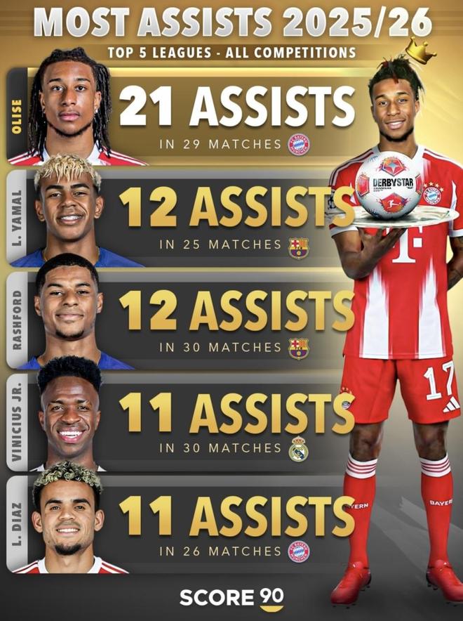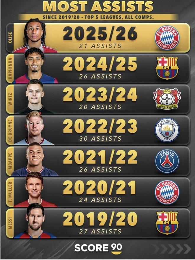 最近Score90做了五大联赛、所有赛事口径的助攻盘点。2025/26赛季还在进行中,奥利塞这段时间的表现已经把“助攻王”的气势打出来了:他不只是暂时领跑,而是用连续不断的输送把领先优势先拉开,节奏也明显更快。更关键的是,这种表现放到更长的时间轴里也站得住——他已经进入近些年单赛季助攻王的序列,和那些曾经把助攻做到极致的名字并列。赛季接下来怎么走,他能不能把这种节奏一直保持下去,是这组内容最值得关注的地方。(数据截至北京时间2026年1月25日)