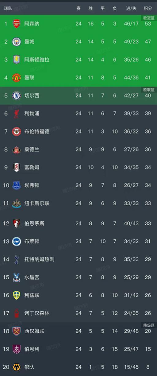 切爾西以40分暫列第5名,利物浦以39分暫列第6名,他們都還有很大的機會沖擊前四,目前最大的競爭對手就是第4的紅魔,藍軍落後紅魔1分,紅軍落後紅魔2分。佈倫特福德、桑德蘭、富勒姆、埃弗頓、紐卡斯爾聯、伯恩茅斯和佈萊頓的積分都在30分以上,暫列第7-第13名。西漢姆聯20分,伯恩利15分和狼隊8分處於降級區,排在最後三名。