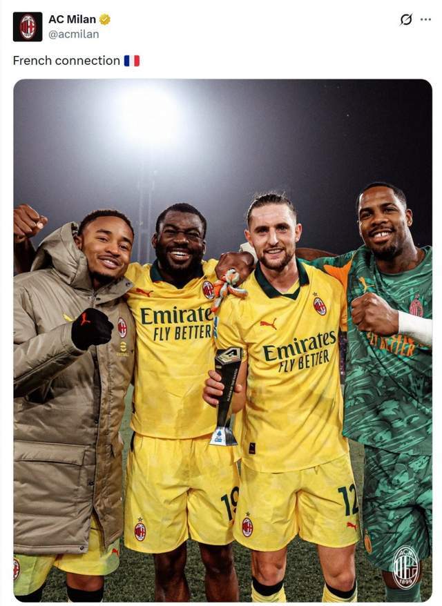 而拉比奧特的爆發,也是米蘭“法國幫”集體發威的體現。本場除瞭他,恩昆庫創造點球並罰進,邁尼昂穩健零封,福法納踢滿全場。米蘭官方社媒賽後特意曬出四人合照,配文“法國幫”。這條中軸線(門將-中場-前鋒)的穩定輸出和默契,構成瞭米蘭戰術體系的國際縱隊核心,他們的出色狀態是球隊戰績的硬保障。