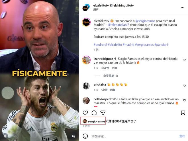 随后,该节目官方社交媒体账号分享了这段潘迪亚尼的发言视频片段,而拉莫斯很快便点赞了这条帖子。