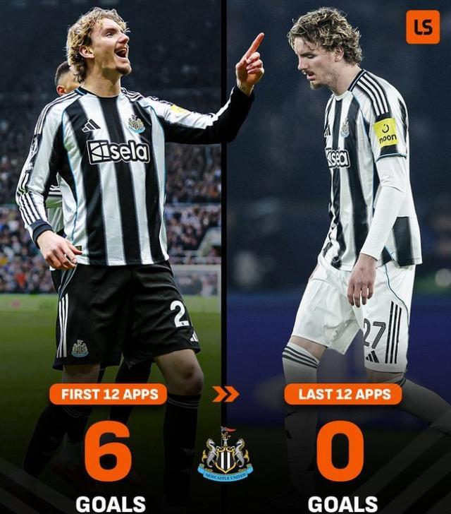 據統計,沃爾特馬德在代表紐卡斯爾聯的前12場比賽中打進6球,但在過去的12場比賽中,他顆粒無收。他上一次進球還是在英超第17輪對切爾西的比賽中上演的梅開二度。