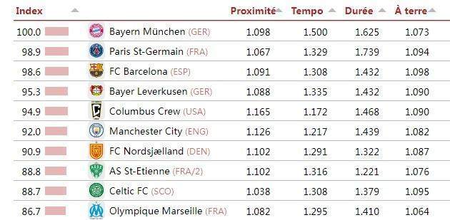 知名数据评测机构足球天文台(CIES)基于合作伙伴Impect的数据,结合58个主流联赛公布了全球最具“控球主导、传控风格”的球队排名,拜仁以100分的基准分登顶榜首,巴黎巴萨分列二三位。数据核心排名标准通过以下四项技术指标综合评定:传球距离(越短越好)、控球阶段的传球速度、平均单次控球时长,以及在前场三分之一区域,膝盖以下接球的百分比。排名第一的拜仁获得了100分的综合评分(即其他球队以拜仁的100分作为综合指标),巴黎、巴萨作为二、三名分获98.9和98.6分。第4-10名分别为:勒沃库森(德甲)、哥伦布机员(美职联)、曼城(英超,92分)、北西兰(丹麦超)、圣埃蒂安(法乙)、凯尔特人(苏超)、马赛(法甲)。11-20名分别为:布拉加(葡超)、博德闪耀(挪超)、吉达联合(沙特联)、皇马(西甲,84分)、哈马比(瑞典超)、圣地亚哥(美职联)、锡尔克堡(丹麦超)、利物浦(英超,81.9分)、洛杉矶FC(美职联)和埃尔切(西甲)