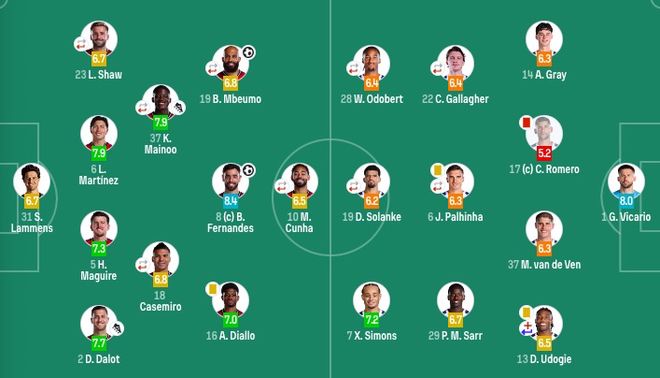 曼聯首發:31-拉門斯、2-達洛特、5-馬奎爾、6-利桑德羅、23-盧克·肖(87’3-馬茲拉維)、18-卡塞米羅(87’15-約羅)、37-梅努(92’39-泰勒·弗萊徹)、16-阿瑪德、8-B費、10-庫尼亞(75’30-謝什科)、19-姆伯莫(87’11-齊爾克澤)