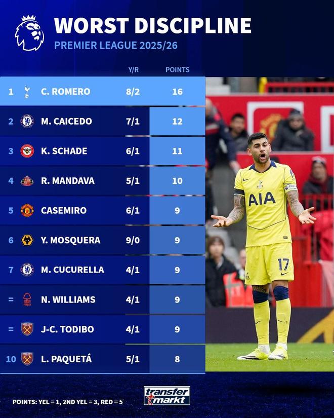 1. 克裡斯蒂安-羅梅羅(熱刺) 8黃2紅 16分