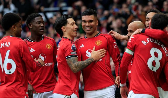 比賽剛剛開始不久,曼聯就創造出機會。阿馬德在右側內切兜射遠角,被撲瞭出去。第13分鐘,曼聯差一點丟球,幸好門將反應極快,在門線伸手擋出瞭必進球。5分鐘後,庫尼亞被放倒,裁判判罰點球,但隨後改判為任意球。佈魯諾-費爾南德斯主罰,他把球罰進禁區,卡塞米羅搶點頭球攻門,球進瞭!曼聯取得領先。