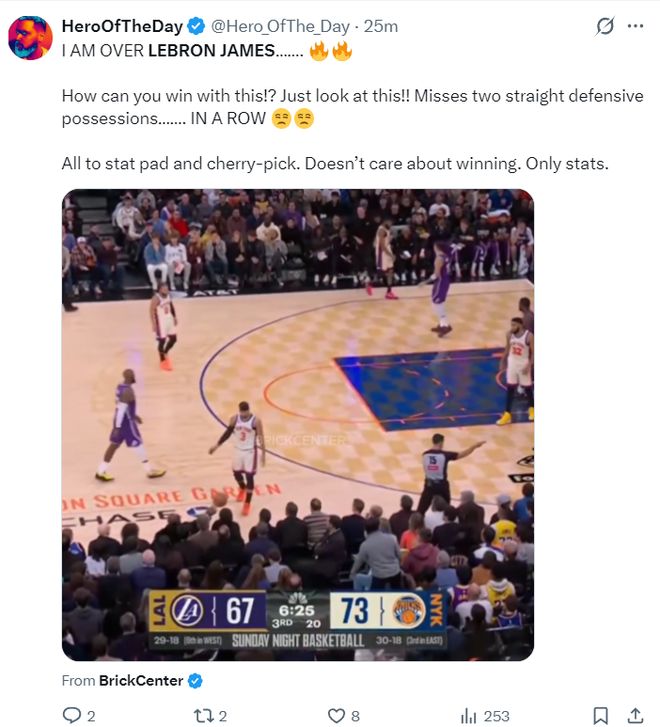 著名詹黑媒體賽後吐槽勒佈朗的防守(正好就是湖人第三節崩盤的開始):我對勒佈朗-詹姆斯已經厭倦瞭,他這樣打球怎麼可能贏?看看這個瞬間吧,連續兩個防守回合都漏人,他隻顧著刷數據、挑有利數據的位置,他根本不在乎輸贏,隻在乎數據。