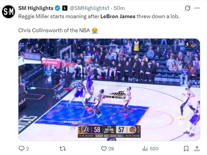 第三節勒佈朗又在一次下快攻時完成瞭空接平筐暴扣,41歲的老頭子確實還能飛,來到麥迪遜廣場花園球館看球的富豪們也對得起票價瞭,畢竟這場比賽票價都是900多美元。