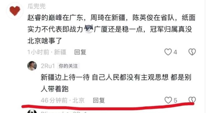 北京男籃在主場不敵青島男籃,這場比賽是球隊歷史上首次在主場輸給對手。比賽結束後,很多北京球迷都表達瞭對球隊表現的不滿,也有不少球迷喊話主教練許利民下課。有新疆球迷在社交媒體上發表瞭自己的看法,認為趙睿、周琦、陳盈駿等球員都過瞭巔峰期,冠軍歸屬真沒北京男籃啥事。這位新疆球迷的表達引發瞭趙睿的關註,他在下面進行瞭留言,但卻引發瞭球迷的不滿,不少球迷紛紛打電話進行舉報。