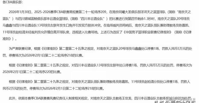 剛剛,CBA公司開出罰單,根據《紀律準則》第二章第二十五條之規定,對南京同曦馬鑫鑫處以停賽1場、罰款人民幣5萬元的處罰;對南京同曦領隊兼助理教練員陳嘉凱、11號球員趙柏清分別處以停賽1場、罰款人民幣2萬元的處罰;對南京同曦主教練王世龍,罰款1萬處罰。