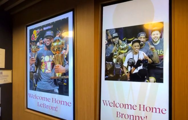 賽前,騎士隊也在客隊更衣室門口掛上瞭兩張歡迎回傢的海報,海報的主角是詹姆斯和他的兒子佈朗尼。無獨有偶,就在今天,有報道稱,騎士對詹姆斯第三次加盟持歡迎和開放態度,當然前提是詹姆斯成為自由球員。畢竟,騎士已經超過第二土豪線,很難通過交易來得到詹姆斯。