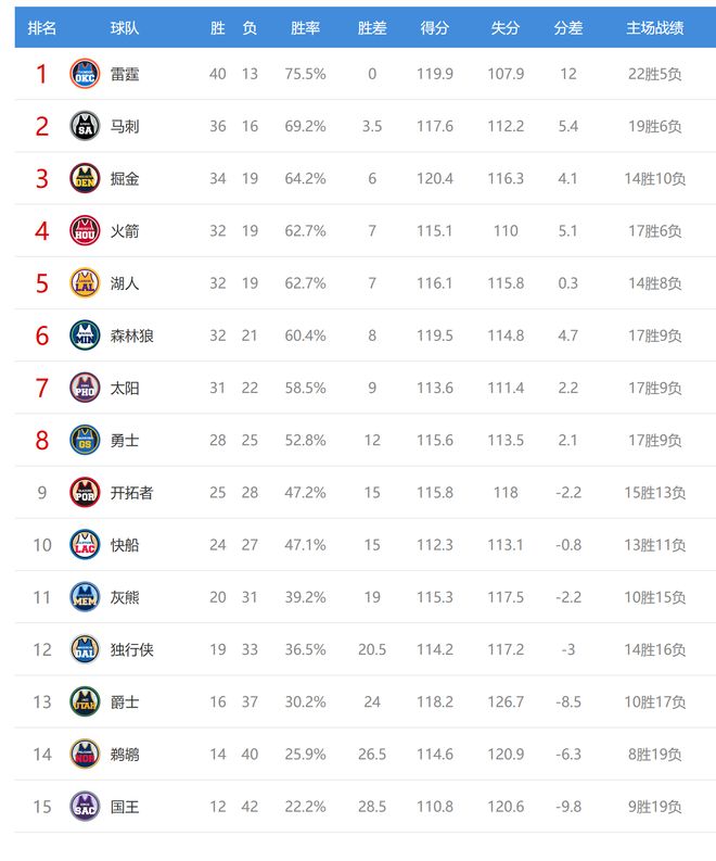 馬刺贏球後4連勝,戰績36勝16負排名西部第二,領先第三的掘金2.5個勝場。