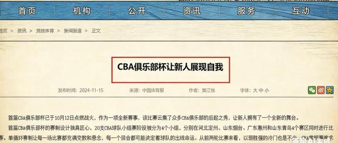 2024-25賽季,CBA開始創建俱樂部杯,旨在給本土年輕球員展現舞臺,為他們提供更多表現機會。為此,中國體育報甚至曾在國傢體育總局官網上刊文《CBA俱樂部杯讓新人展現自我》,以彰其義。