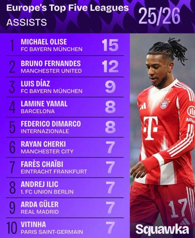 B費本賽季至今在聯賽中已貢獻12次助攻,排名歐洲五大聯賽第2位,僅次於拜仁的奧利塞。
