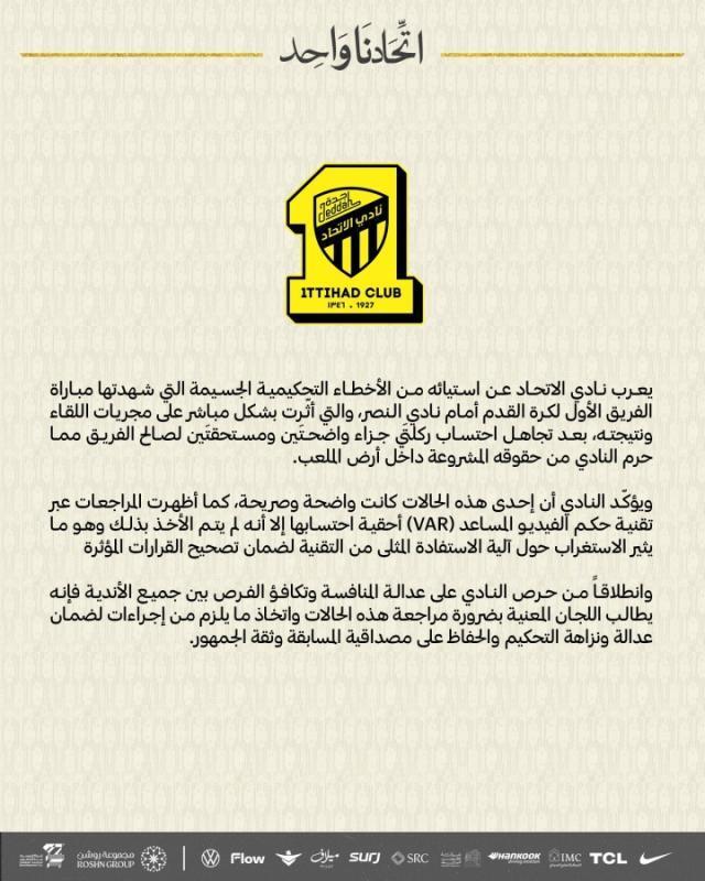 02月07日讯 沙特联焦点战,吉达联合0比2不敌利雅得胜利。赛后,吉达联合发表声明,抗议球队被漏判点球。吉达联合公告:吉达联合俱乐部对其一线队对阵利雅得胜利的比赛中出现的严重判罚失误表示不满,这些失误直接影响了比赛的进程与结果。球队本应获得的两次清晰、合理的点球机会被无视,这剥夺了俱乐部在球场上的正当权益。俱乐部确认,其中一次点球判罚的情况清晰明确,视频助理裁判(VAR)的回放也显示点球应当判罚,但这一结果并未被采纳。这引发了人们对技术手段是否被充分运用以纠正关键判罚的质疑。