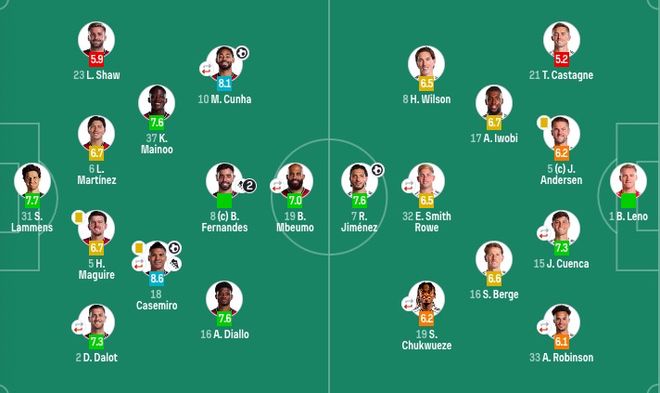富勒姆首發:1-萊諾、21-卡斯塔涅、5-約阿希姆·安諾森、15-昆卡(86'3-巴錫)、33-羅賓遜(71'30-塞塞尼翁)、16-博格、17-伊沃比、8-哈裡-威爾遜、32-史密斯-羅(71'22-凱文)、19-丘庫埃澤(79'10-凱爾尼)、7-希門尼斯