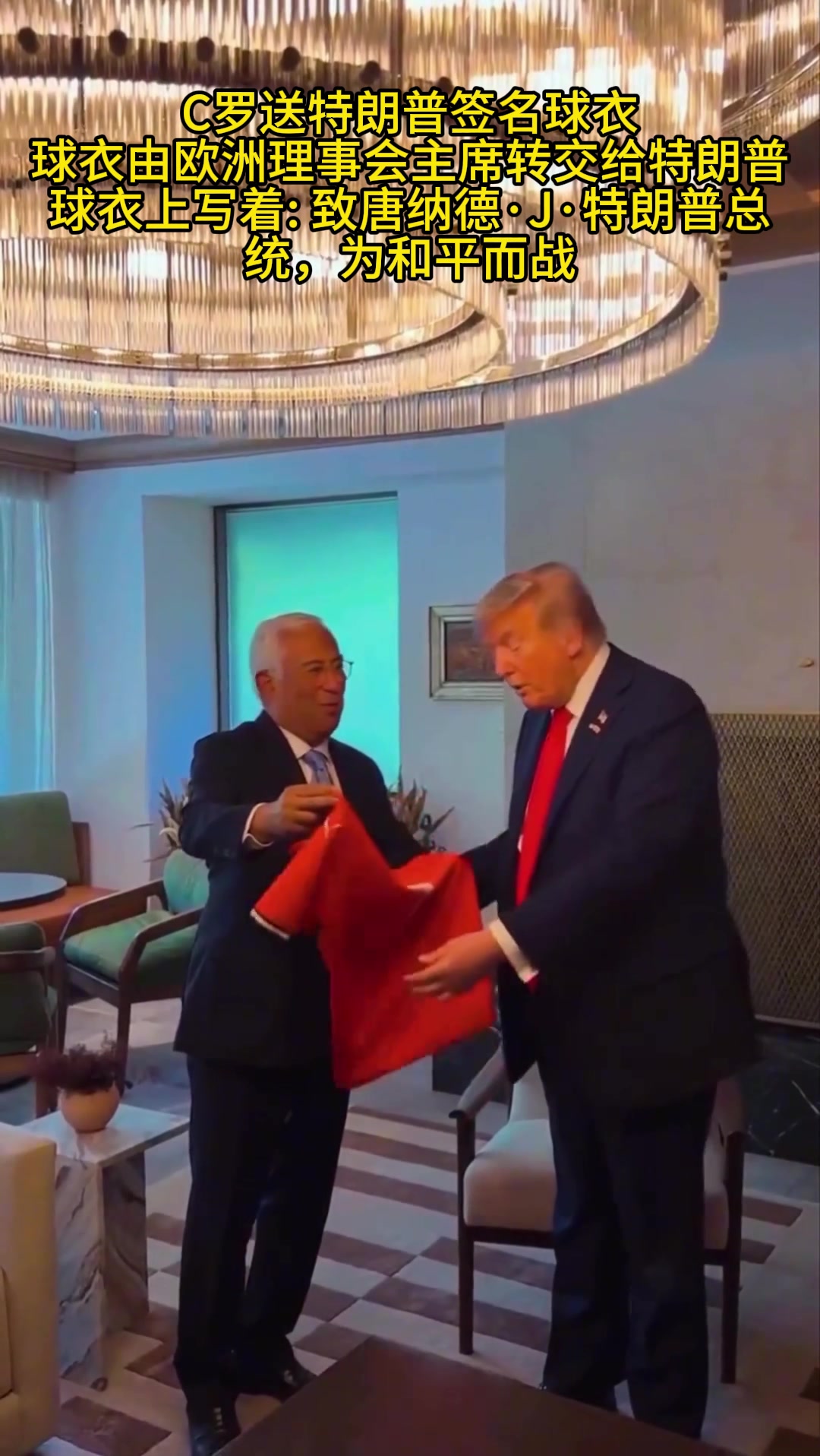 C罗送特朗普签名球衣球衣由欧洲理事会主席转交给特朗普